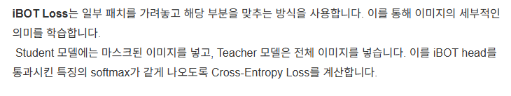 - (Patch-level Objective): 이미지 내의 특정 패치(Patch)들을 대상으로 하는 손실 함수입니다. 이미지의 일부를 가리고(Masking) 이를 복원하는 잠재적 재구성(Latent Reconstruction) 과정을 통해 국소적인 특징 (Local Features)을 학습하도록 돕습니다.