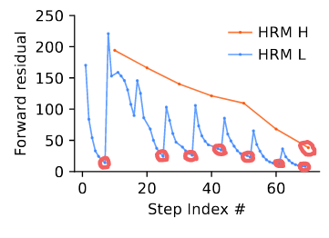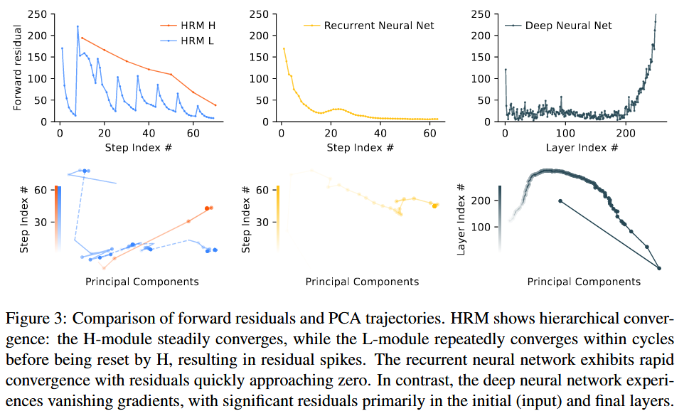 ⇒ HRM이 (표준 RNN처럼 활동성이 급격히 감소하는 것과는 대조적으로) 많은 단계에 걸쳐 높은 계산 활동성(forward residual)을 유지하면서도 + 안정적인 수렴을 누릴 수 있음을 보여줌.