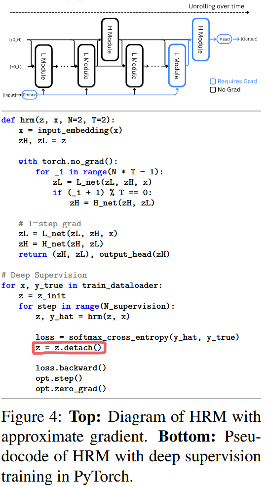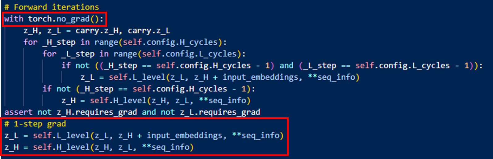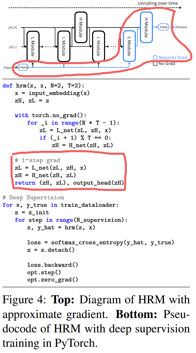 H module은 해당 사이클(N번의 recurrent)이 끝날 때의 L module의 최종 상태를 사용하여, 사이클당 한 번만 H의 hidden state 를 update.