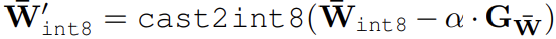weight update 또한 int8 형식으로 유지된다. update된 weight 공식은 아래와 같다.