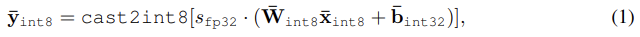 // s는 연산 결과를 다시 int8로 매핑하기 위한 fp scaling factor이다.