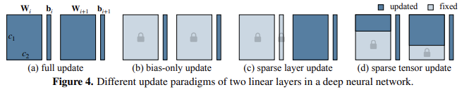 QAS를 통해 quantized된 model의 optimized가 가능해졌지만, 전체 model(또는 마지막 몇 개의 블록)을 update하려면 대량의 메모리가 필요하며, 이는 TinyML 환경에서는 감당할 수 없다. 이를 해결하기 위해, layer과 tensor를 sparsely하게 update하는 방식을 도입한다.