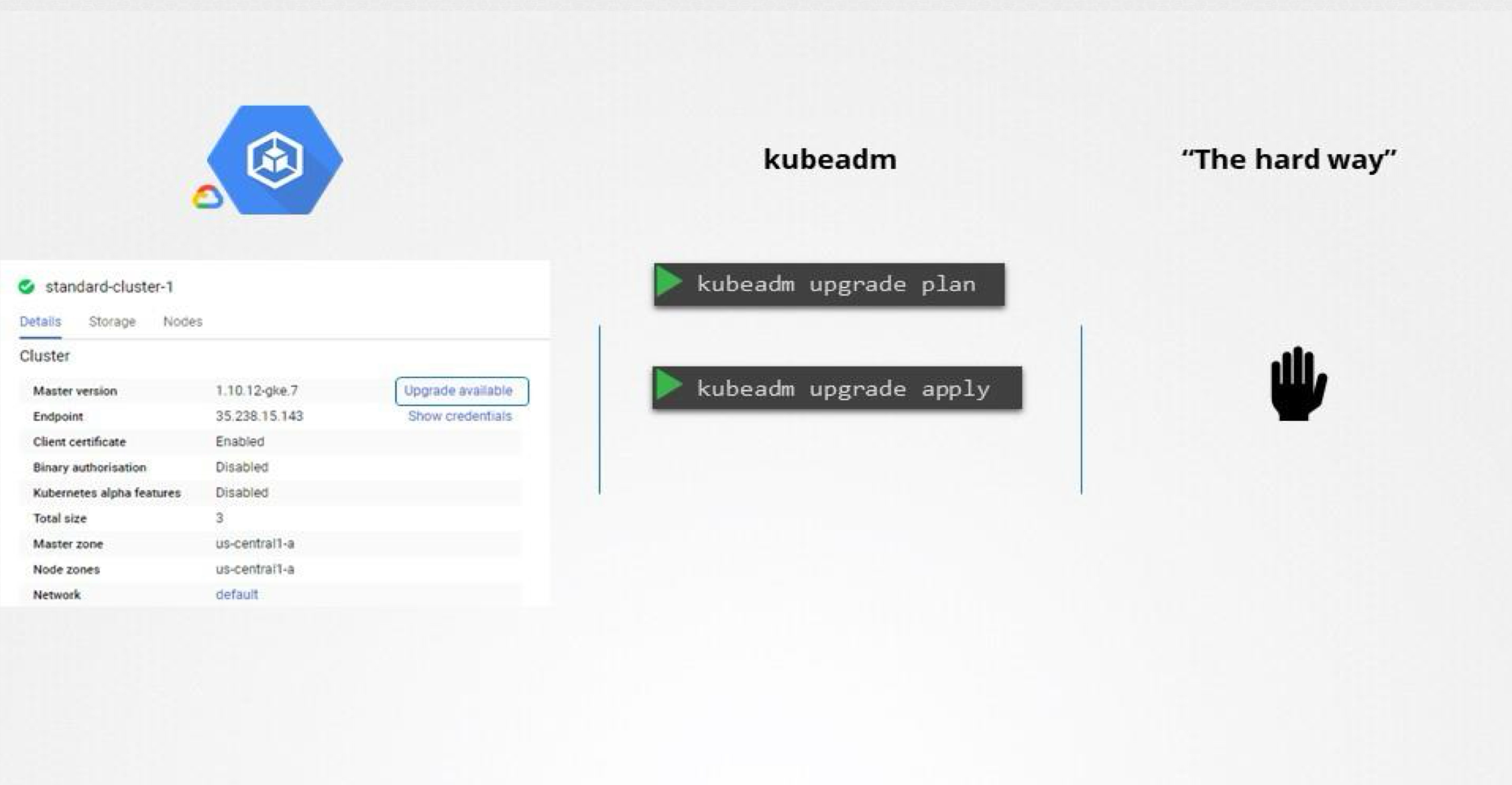 kubectl이 아니고 kubeadm이다!controlplane의 구성 요소 현재 버전이 표시되고 업그레이드 가능한 버전의 정보도 얻을 수 있다controllplane 구성 요소를 업글 한 뒤에 노드에서 수동(manually)으로 kubelet 버전을 업그레이드 해야 한다kubeadm은 kubelet의 버전을 절대 업그레이드 하지 않는다kubeadm 도구부터 업그레이드 한다kubeadm 툴은 K8S와 같은 소프트웨어 사용