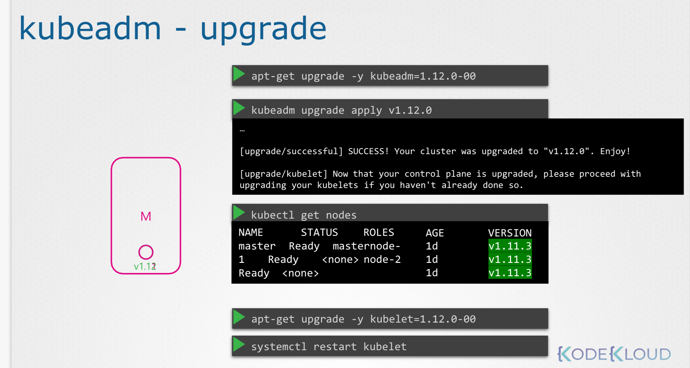 kubeadm과 클러스터를 업그레이드kubectl get node 명령어로 조회된 버전은 kube-apiserver 자체의 버전이 아닌 kubelet의 버전임kubelet 을 수동으로 업그레이드 해야함kubelet이 실행될 수도 아닐 수도 있음 kubeadm으로 배포된 클러스터에는 마스터노드에 kubelet 이 존재한다.kubelet을 설치하고 재기동 하면 kubectl get nodes 명령어로 조회시 해당 노드의 버전이 업그레이드 되어있음을 확인kubectl drain node01 명령어로 해당 노드의 모든 pod를 안전하게 종료한다$ apt-get upgrade -y kubeadm-1.12.0-00