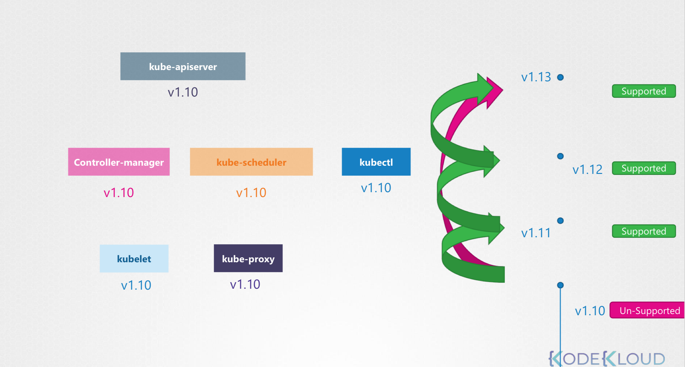 kube-apiserver 보다 높은 버전을 사용할 순 없다Controller-manager와 kube-scheduler는 한 버전은 더 낮출 수 있다kubelet이나 kube-proxy는 두 버전 이상 낮을 수 있다kubectl은 kube-apiserver 보다 한 버전 더 높을 수 있다
