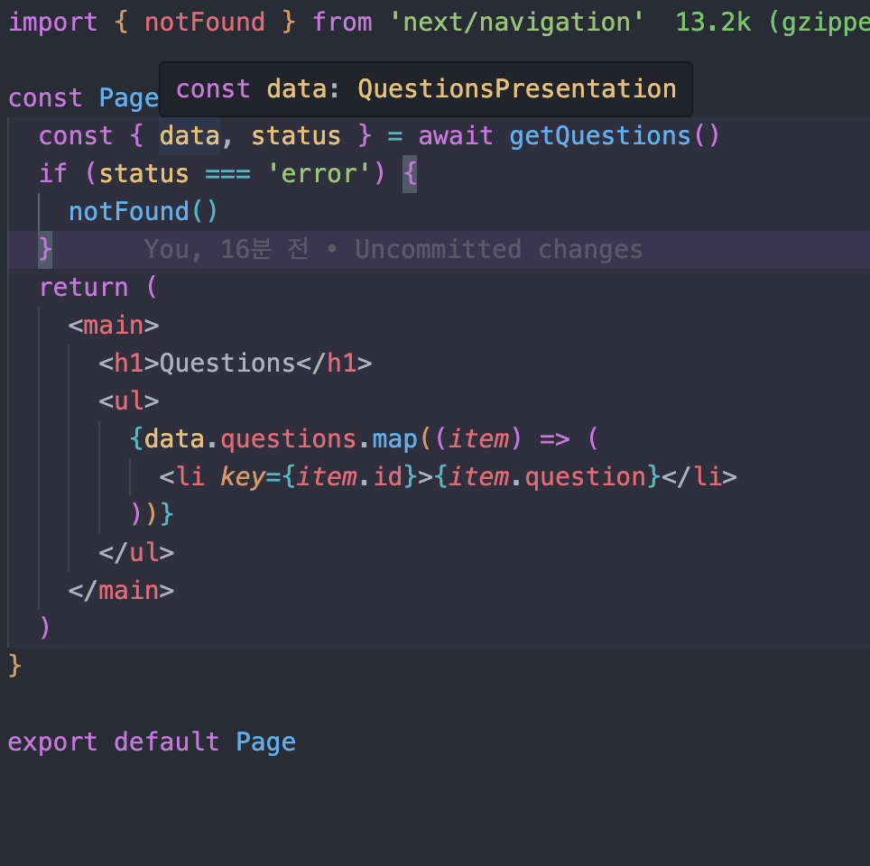 qetQuestions에 역할은 api를 호출한 후 presentation으로 반환하는 역할을 합니다.