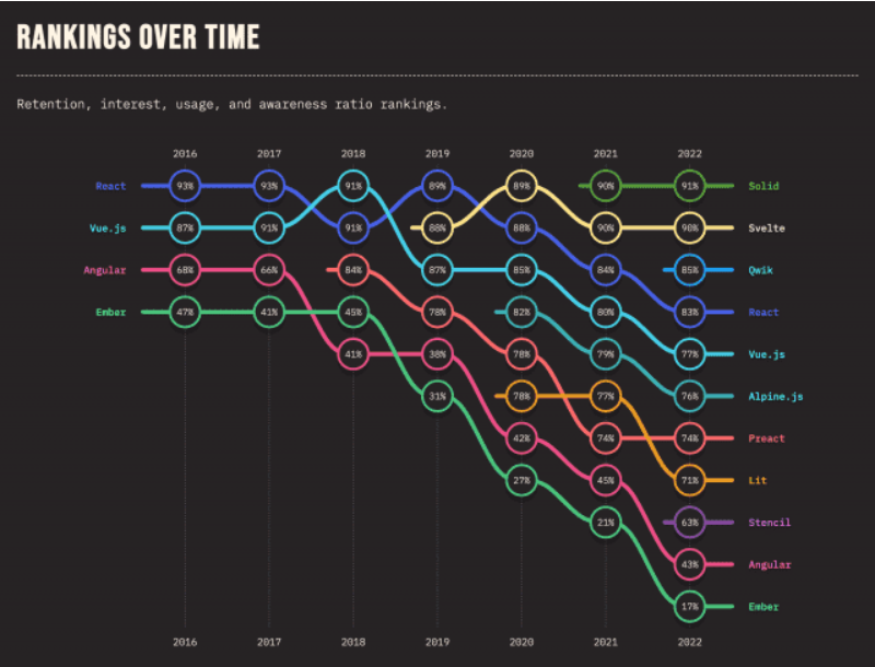 React, Vue.js 에 비해 점점 사용이 줄어드는 추세를 보이고 있습니다.