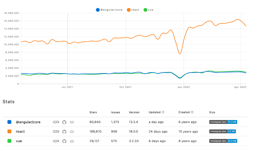 2) 뒷 배경이 Google이다. 개발사가 Google 이라는 것은 큰 장점이라고 생각한다. 전 세계에서 가장 똑똑한 개발자들이 모여서 만든 프레임 워크인 만큼 성능이 보장되고 오랜 기간 프레임 워크를 서포팅이 가능하겠다는 판단을 할 수 있다. (AngularJS 사례를 보면 그 믿음이 …)