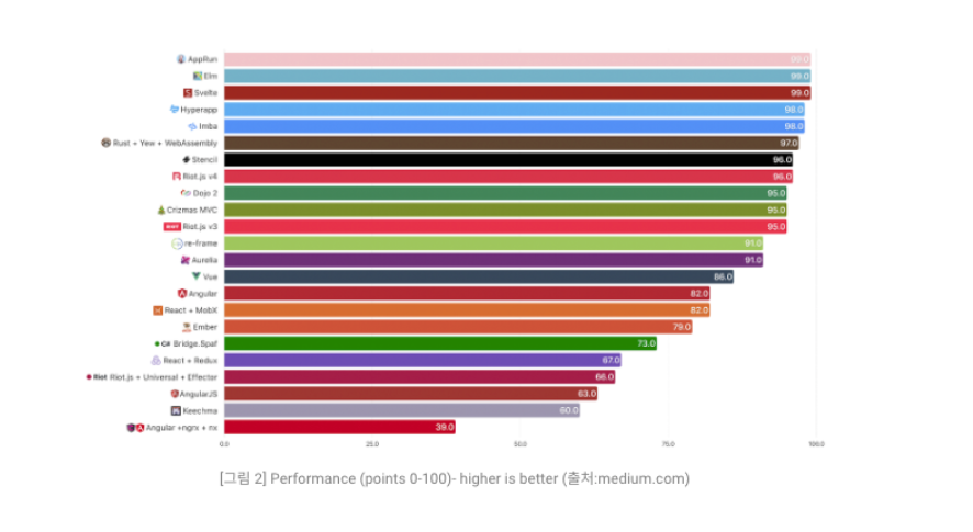 아래 사진은 프레임워크 및 아키텍처의 랜더링 퍼포먼스를 수치상으로 기록 해놓고 있다. 위 사진을 살펴보면 앵귤러는 82 point 를 지니고 있다. 그에 비해서 React + Redux 는 67 point 를 지니고 있다. 결론적으로 가장 많이 사용되는 아키텍처인 React + Redux 보다 수치상으로 15 Point 를 앞선다고 볼 수 있다. (물론 환경이나 여러가지 변수를 고려하지 않은 수치 데이터임을 확인해야 한다.)