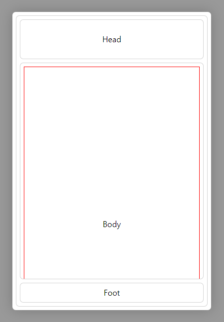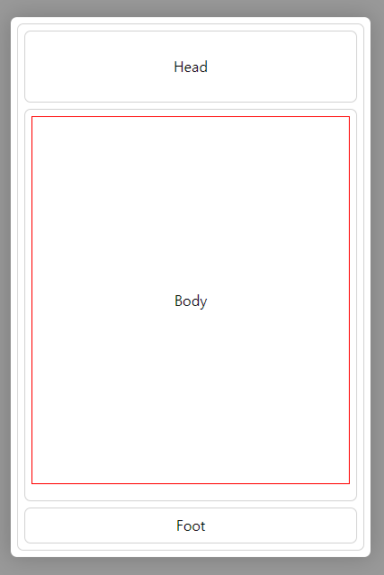 .flex-container{ display: flex; flex-direction: column; justify-content: center; align-items: center } .head { width: 100%; height: 80px } .body { flex: 1; <---------------여기 부분! width: 100%; } .foot { width: 100% height: 40px }```
