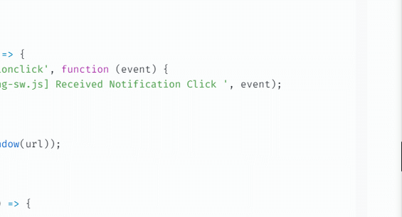 importScripts('https://www.gstatic.com/firebasejs/10.4.0/firebase-app-compat.js'); importScripts('https://www.gstatic.com/firebasejs/10.4.0/firebase-messaging-compat.js'); // ... const listenBackgroundMessage = () => { const messaging = firebase.messaging(); messaging.onBackgroundMessage((payload) => { console.log('[firebase-messaging-sw.js] Received background message ', payload); const { title, options } = createNotificationItem(payload); return self.registration.showNotification(title, options); }); }; const listenNotificationClick = () => { self.addEventListener('notificationclick', function (event) { console.log('[firebase-messaging-sw.js] Received Notification Click ', event); const url = '/'; event.notification.close(); event.waitUntil(clients.openWindow(url)); }); }; const listenNotificationEvents = () => { listenBackgroundMessage(); listenNotificationClick(); }; const initServiceWorker = async () => { if (firebase.apps.length === 0) { firebase.initializeApp(firebaseConfig); } const isMessagingSupported = await firebase.messaging.isSupported(); if (!isMessagingSupported) { return console.warn('[firebase-messaging-sw.js] Messaging is not supported.'); } listenNotificationEvents(); }; console.log('[firebase-messaging-sw.js] Loaded Service Worker'); initServiceWorker();