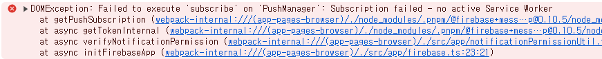 pushManager의 구독 목록을 얻고, 구독이 없다면 구독을 진행하게 됩니다. 하지만, pushManager에서 활성화 된 서비스 워커가 없이 구독을 시도하게 되면 아래의 메시지를 마주하게 됩니다.