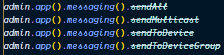 admin.app().messaging().sendAll admin.app().messaging().sendMulticast admin.app().messaging().sendToDevice admin.app().messaging().sendToDeviceGroup