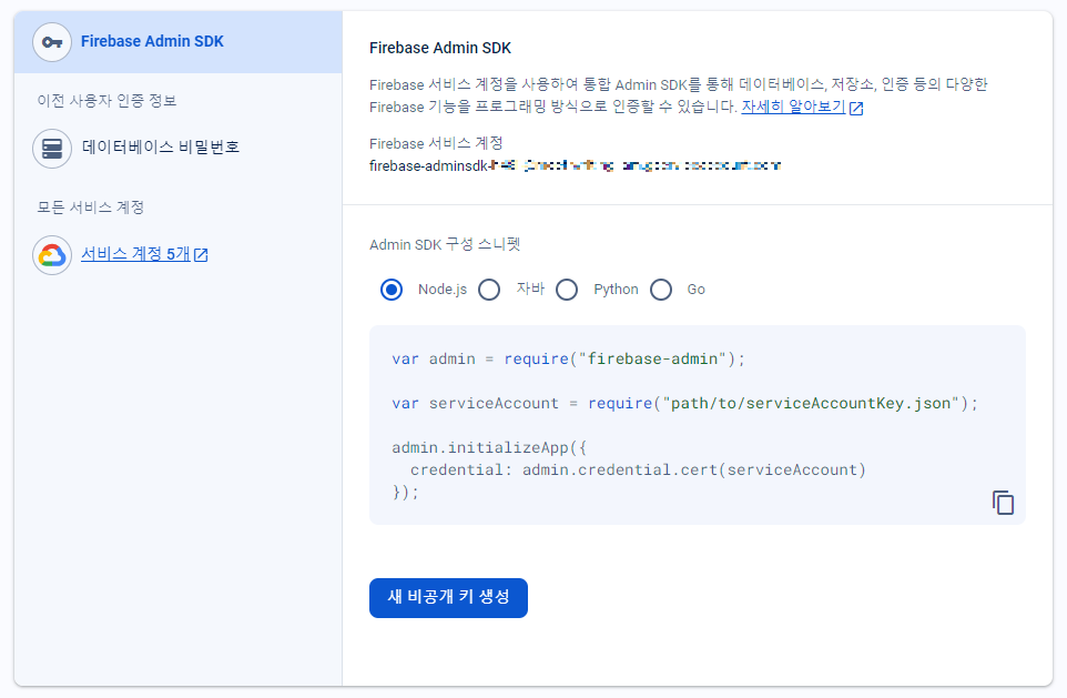 Firebase 콘솔 > 프로젝트 설정 > 서비스 계정으로 들어가서 새 비공개 키 생성을 누르면 JSON파일이 하나 다운로드 되는데, 이 파일로 프로젝트 설정하면 되겠습니다.