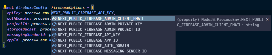 namespace NodeJS { interface ProcessEnv { NEXT_PUBLIC_FIREBASE_API_KEY: string; NEXT_PUBLIC_FIREBASE_AUTH_DOMAIN: string; NEXT_PUBLIC_FIREBASE_PROJECT_ID: string; NEXT_PUBLIC_FIREBASE_STORAGE_BUCKET: string; NEXT_PUBLIC_FIREBASE_MESSAGING_SENDER_ID: string; NEXT_PUBLIC_FIREBASE_APP_ID: string; NEXT_PUBLIC_FIREBASE_VAPIDKEY: string; FIREBASE_ADMIN_PROJECT_ID: string; FIREBASE_ADMIN_CLIENT_EMAIL: string; FIREBASE_ADMIN_PRIVATE_KEY: string; // GOOGLE_APPLICATION_CREDENTIALS: string; } }