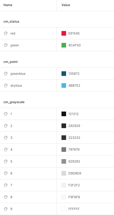 상태에 따라 지정해줄 색을 정의하고, 포인트 색을 정의하고, 명암(grayscale)을 정의해주었다. 명암은 12단계로 하려다가 넘 많은 것 같아서 8단계로 줄였다. #FFF는 Light Mode의 배경을 위해서 선언해주었다.
