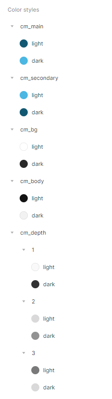 이제 이건 테마에 따라서 달라질 컬러들을 정의해놓았다. 메인, 세컨, 배경, 본문, 깊이로 나누었다. 개인적으로 Depth에 대한 이름에 대해서 고민이 많았는데, 이게 뭐냐면 각 모드에 따라서 섹션을 구분하는 용도로 쓰고 싶었다.