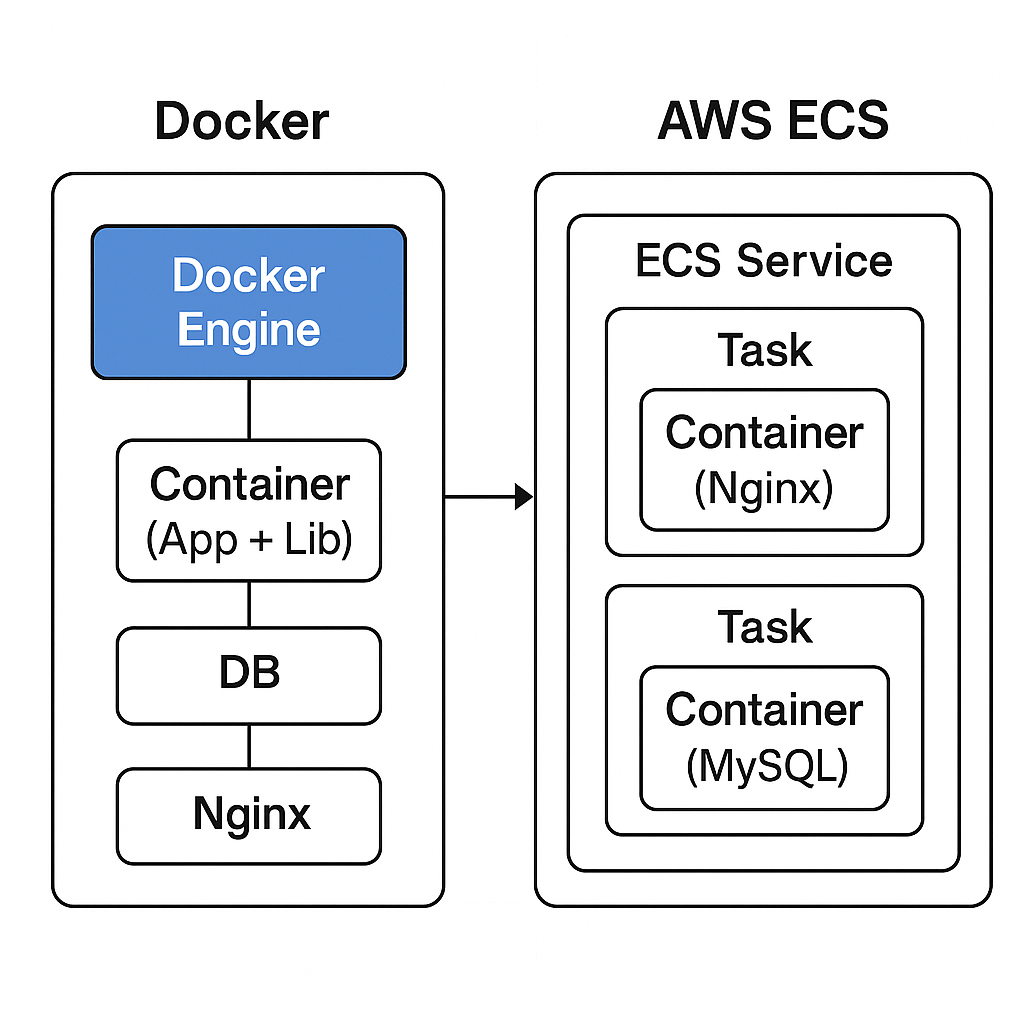 | 정의 | 컨테이너를 빌드하고 실행하는 도구 (로컬 or 서버) | 도커 컨테이너를 클라우드에서 자동으로 배포·관리하는 AWS 서비스 |