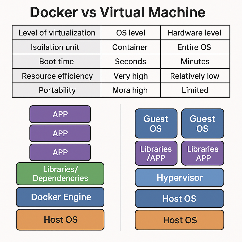 | 기반 기술 | OS 레벨 가상화 (Container) | 하드웨어 레벨 가상화 (Virtual Machine) |