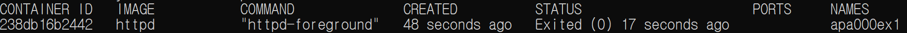 → status가 Exited로 컨테이너가 존재하지만 종료된 상태임을 알 수 있다.