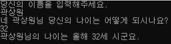 Console.WriteLine("네 {0}님 당신의 나이는 어떻게 되시나요?", name);