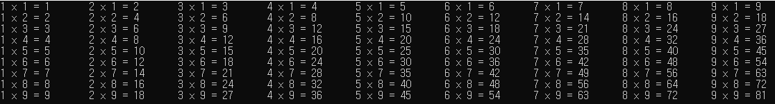 Console.Write(j + " x " + i + " = " + (i * j) + "\t");