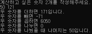 Console.WriteLine("계산하고 싶은 숫자 2개를 작성해주세요.");