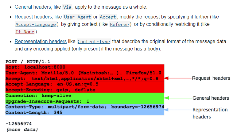 - request header 에선 다른 종류의 많은 헤더들이 나타날 수 있다. 이는 다음과 같은 그룹으로 나눌 수 있다.