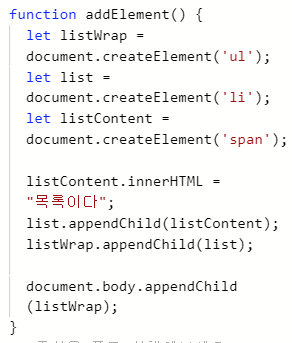 - 사용 이후에는 element.appendChild() 을 통해 html 파일 안에 어디위치로 갈지 정해줘야 한다.