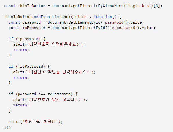 - getElementsByClassName 과 다르게 아이디는 하나밖에 없으므로 getElementById 를 사용하면 후미에 [0] 과 같은 인덱스 값을 지정해 줄 필요가 없다. getElementsByClassName 은 class 가 여러번 쓰일 수 있으므로 return 값이 해당 요소들로 이루어진 array 가 return 되는데 반해, getElemntsById 는 요소 그 자체가 return 된다.