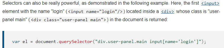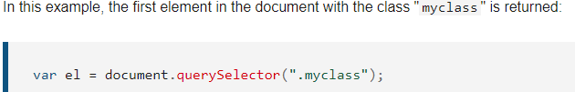 - returns the FIRST element within the document that matches the specified selector, or group of selectors. If no matches are found, NULL is returned.