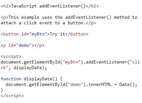 script 태그 내부에 getElementByID("myBtn") 을 통해 해당 root node 에 접근하고, addEventListener("click", displayDate); 을 통해 클릭이라는 이벤트 발생시, displayDate 라는 function 을 콜해주라고 하고있다.