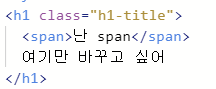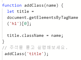 - 위의 코드를 통해 title 이라는 변수에 h1 태그의 [0] 번째 인덱스인 span 태그에 접근하고, title.className = name 을 통해 span tag 에 "title" 이라는 이름의 class 를 추가해준다. index.css 파일에 title 태그에 대한 스타일이 있고, 이에 따라 span 태그내부의 content 가 변경된다.