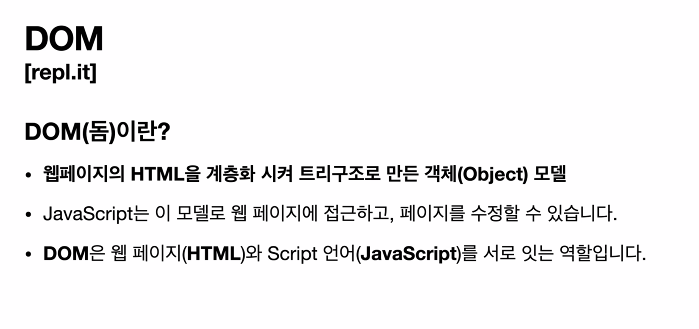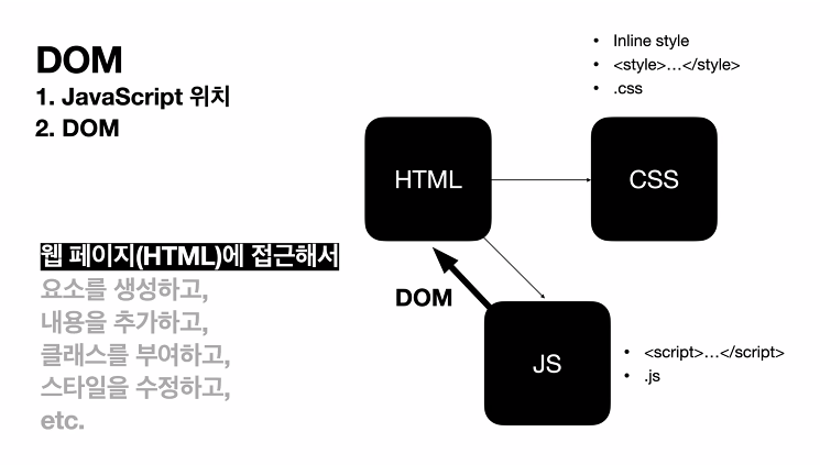 - document 라는 global object 를 통해 javascript 와 html 을 연결 해준다.