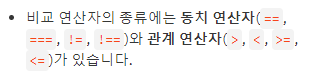 - ===: 엄격(일치) 비교 vs == 추상(동등) 비교