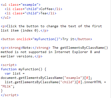 list.getElementsByClassName("Child")[0].innerHTML = "Milk"; 를 통해 coffee 에서 milk 로 수정됨.