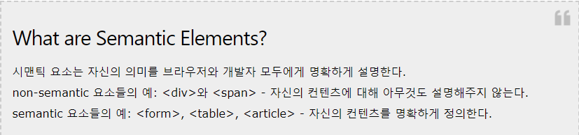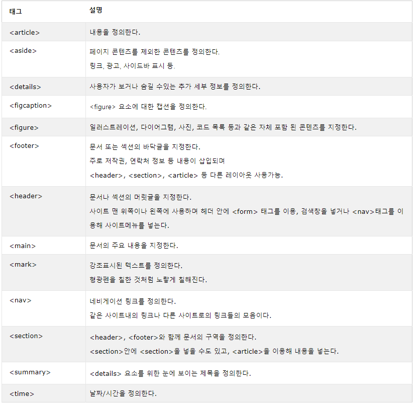 - div 나 span 태그와 같이 class 를 지정하거나 뜯어보지 않으면 컨텐츠의 정의가 정확하지 않다고 한다. 하지만 기타 태그들은 그 이름 자체로써 어떤 역할을 수행하는지 직관적인 정보 전달이 가능하다.
