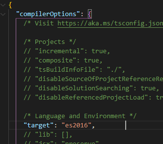 - tsconfig.json파일 안에는 여러 세부 사항들이 있는데, "target": "es2016" 을 "es6" 로 바꿔줌으로써 JavaScript es6 버전으로 컴파일 되도록 변경 해 줄 수 있다.