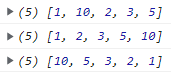 (정렬 기준 함수 미작성 시 문자열 순서로 정렬)const arr2 = [5, 3, 2, 10, 1]; console.log(arr2.sort()); // 기본값인 문자열로 취급 console.log(arr2.sort(function(a,b){return a-b;})); // 정렬 기준오름차순 함수 추가 console.log(arr2.sort((a,b) => b-a)); // 정렬 기준 내림차순 함수 추가