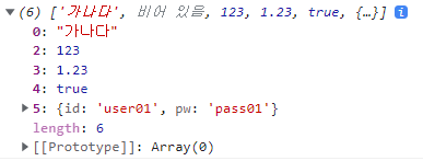 4) 중간에 인덱스를 건너 뛰더라도 건너 뛴 자리를 비워둠arr1[0] = '가나다'; arr1[2] = 123; arr1[3] = 1.23; arr1[4] = true; arr1[5] = {"id":"user01", "pw":"pass01"}; console.log(arr1);