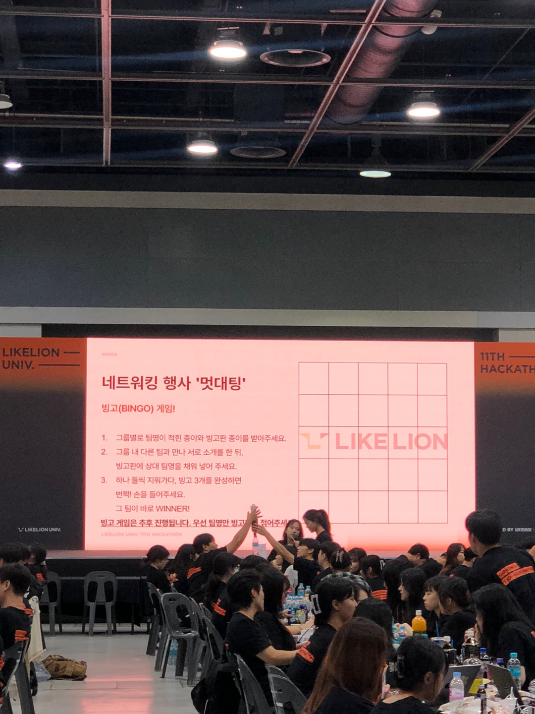 빙고 게임이었는데, 학교들을 각 그룹으로 나누고, 같은 그룹 내 다른 팀의 이름을 물어보며 빙고판에 적고 먼저 빙고를 완성시키는 팀이 이기는 게임이었다.
