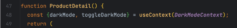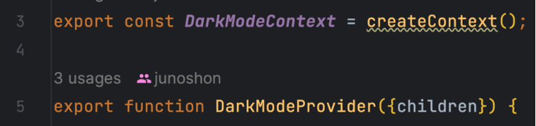 DarkModeContext.jsx 에는 DarkModeContext 라는 변수를 선언해 createContext 로 context를 만들어준다.