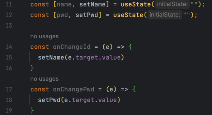 따라서 14번과 17번 라인처럼 id의 입력이 onChange 될 때 실행할 onChangeId와 , 비밀번호의 입력이 onChange 될 때 실행할 onChangePwd 함수를 둘다 만들어줘야 했다.