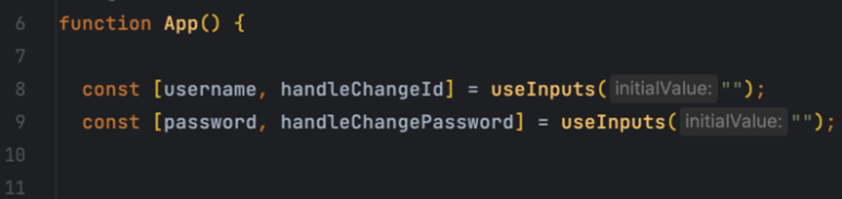 따라서 useInputs 를 사용하는 쪽에서는 handleChangeId 와 handleChangePassword를 직접 구현할 필요가 없다. useInputs에서 만들어서 반환해주기 때문에 그걸 사용하면 된다.