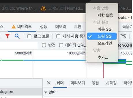 개발자 도구의 Network 탭의 Slow 3G 를 이용해 비동기 요청이 수행되고 있는 동안 로딩중이라는 메시지를 클라이언트에게 보여주는 내용과, 에러 발생 시 에러를 보여주는 내용을 학습했다.