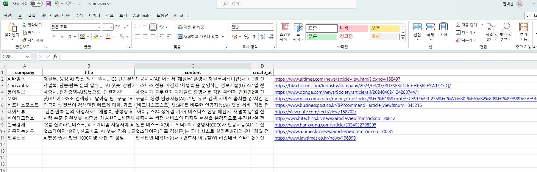 이렇게 만든 변수를 활용하여 엑셀에 크롤링한 데이터를 저장해보았다.