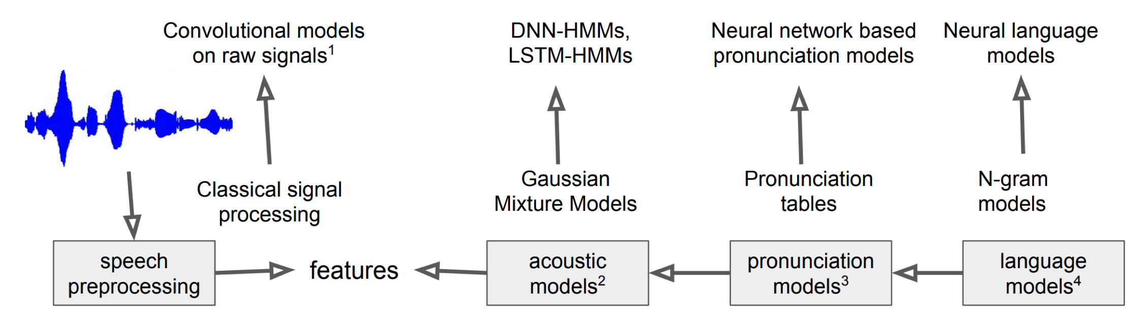딥러닝(Deep Learning)이 대세가 되면서 그림1의 각 컴포넌트들이 딥러닝 기법으로 대체되고 있습니다. 음향 특징 추출(Acoustic Feature Extraction), 음향 모델, 언어모델 등 거의 모든 컴포넌트가 딥러닝으로 바뀌는 추세입니다. 딥러닝 기반 특징 추출 기법과 음향 모델은 각각 Neural Feature Extraction, Neural Acoustic Models을 참고하시면 되겠습니다.