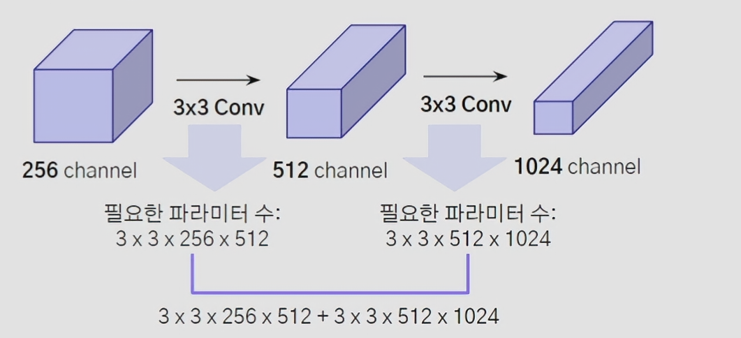 - 계속해서 Channel의 수가 늘어날 경우 모델이 깊어질수록 연산에 필요한 파라미터 수가 급격히 늘어나기 때문에 학습에 어려움이 생기게 됨