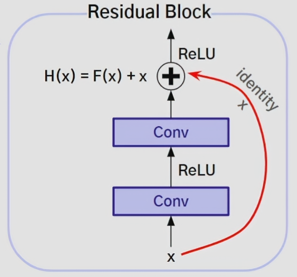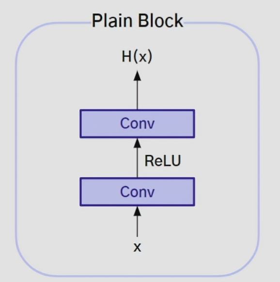 F(x) : x -> conv -> ReLU -> conv -> H(x)