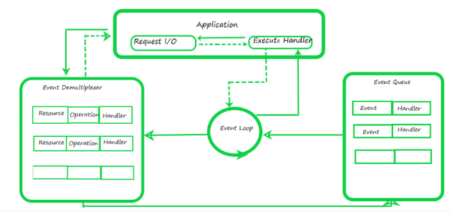 밑에 그림을 보면 초록색 그림에 동그라미가 있다. 이벤트 마다 어떻게 처리( Callback ) 될건지 Round Loading 을 해준다. Event-Loop - where callbacks are assigned and used